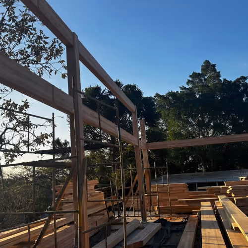 A organização da casa em cinco módulos permitiu racionalizar a estrutura, mantendo coerência dimensional nas vigas e repetição construtiva ao longo do projeto. Mesmo em um contexto voltado ao aconchego e à biofilia, o sistema estrutural foi desenvolvido com lógica técnica clara, garantindo eficiência e previsibilidade construtiva.