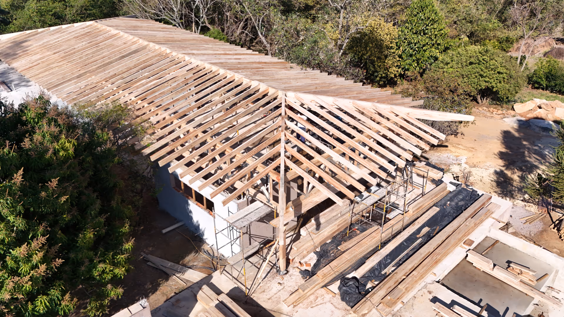 O principal desafio técnico esteve na cobertura de quatro águas com inclinação reduzida de 20%. Diferente das inclinações mais usuais entre 35% e 40%, essa configuração impôs limitações estruturais importantes, exigindo soluções específicas para garantir rigidez, estabilidade global e controle de esforços horizontais.