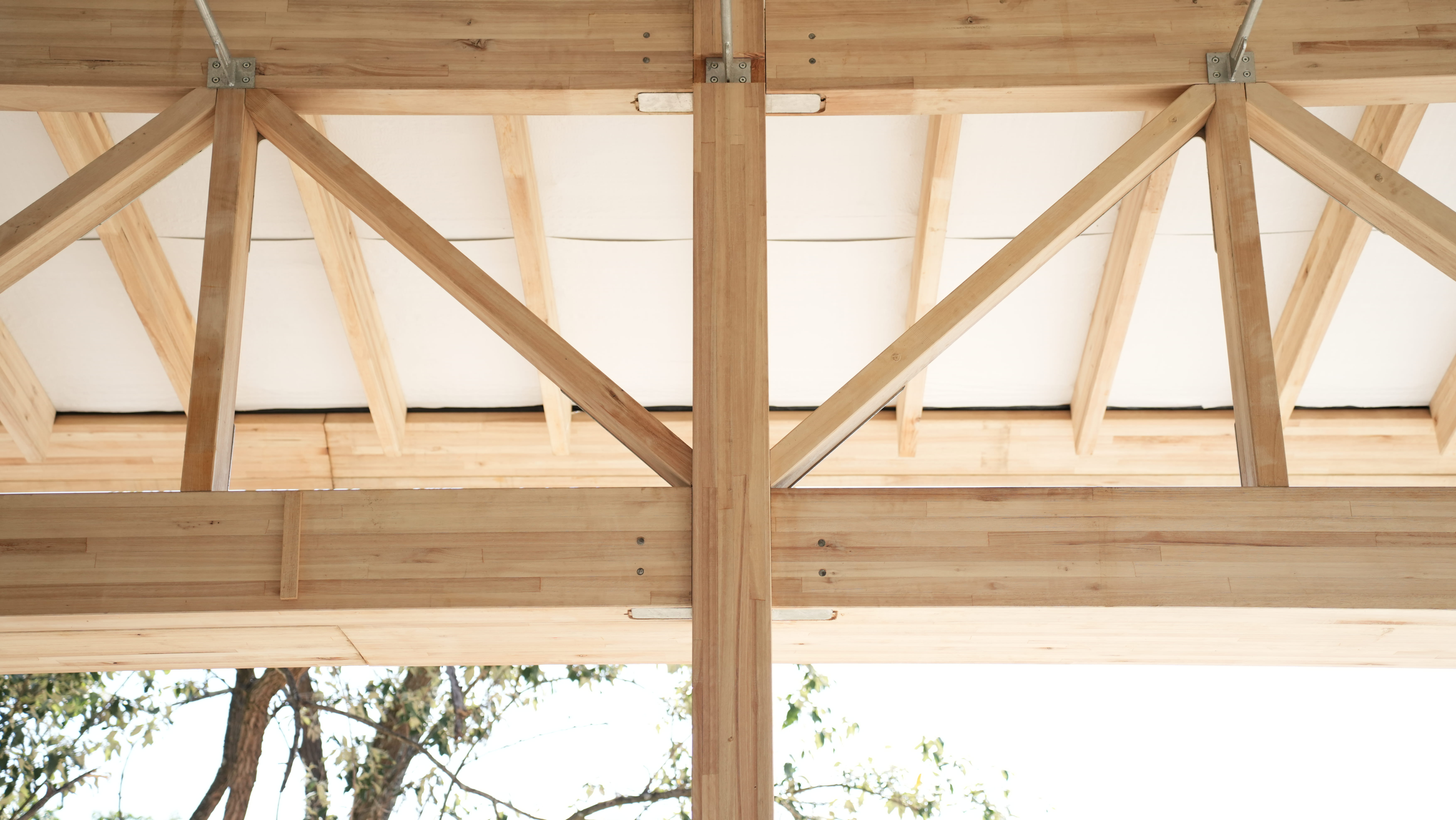 A viga em balanço na área da churrasqueira utiliza um encaixe tradicional da carpintaria, a mão de amigo, combinando técnica estrutural clássica com linguagem contemporânea, reforçando a modularidade do conjunto.